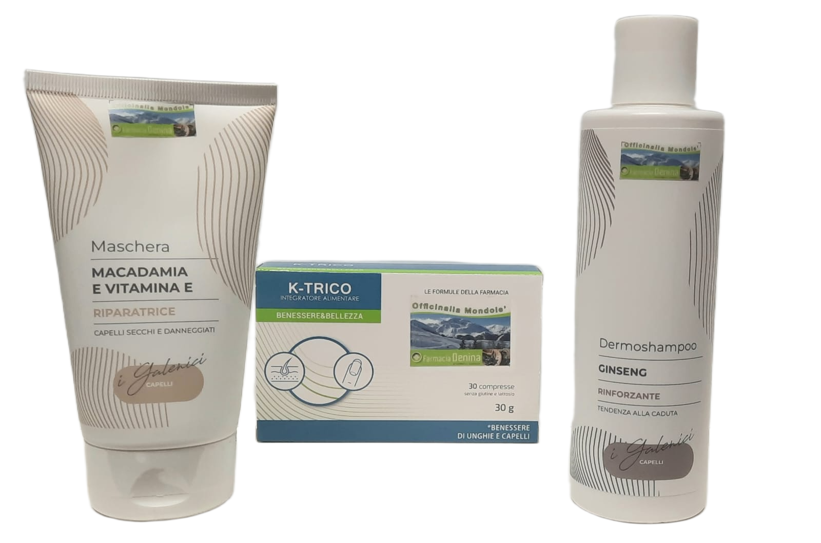 Supporta in modo completo la salute e la densità dei capelli: il nostro pacchetto comprende una Maschera Capelli Macadamia & Vitamina E 200 ml, l’integratore K-Trico 30 compresse, e lo Shampoo Anticaduta Delicato 200 ml al ginseng.